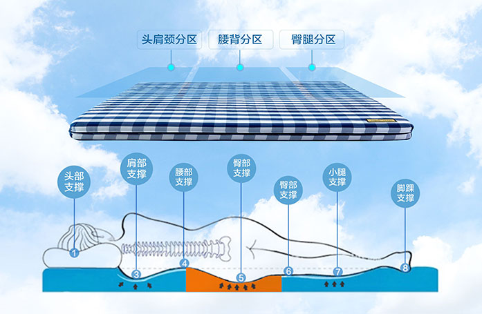 经典蓝白格子防螨面料,裥花层贴合儿童骨骼分布采用7区分区,连续裥花工艺亲肤柔软,舒爽透气,增强睡感体验让缤纷美梦更加甜美,助力童真童趣。